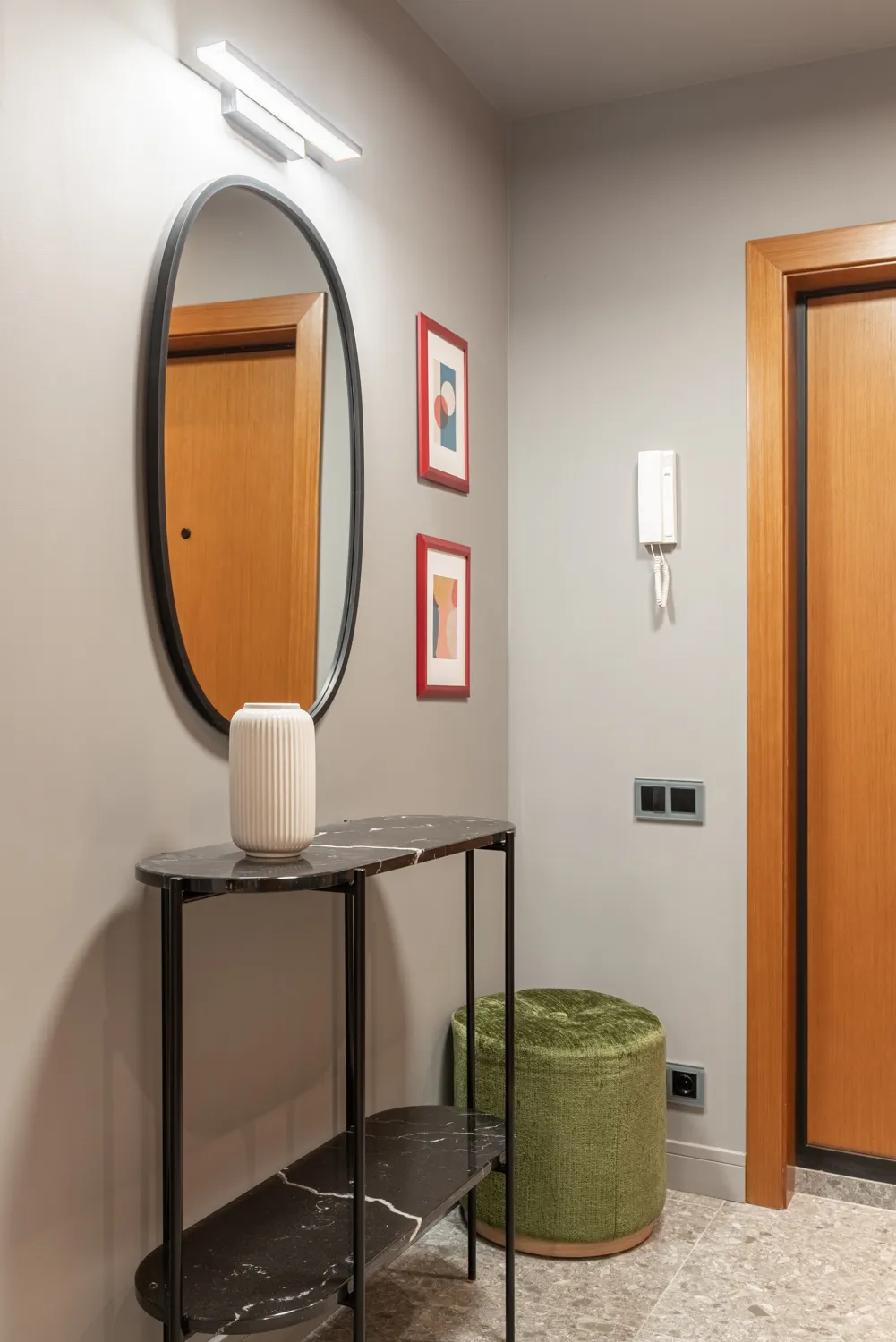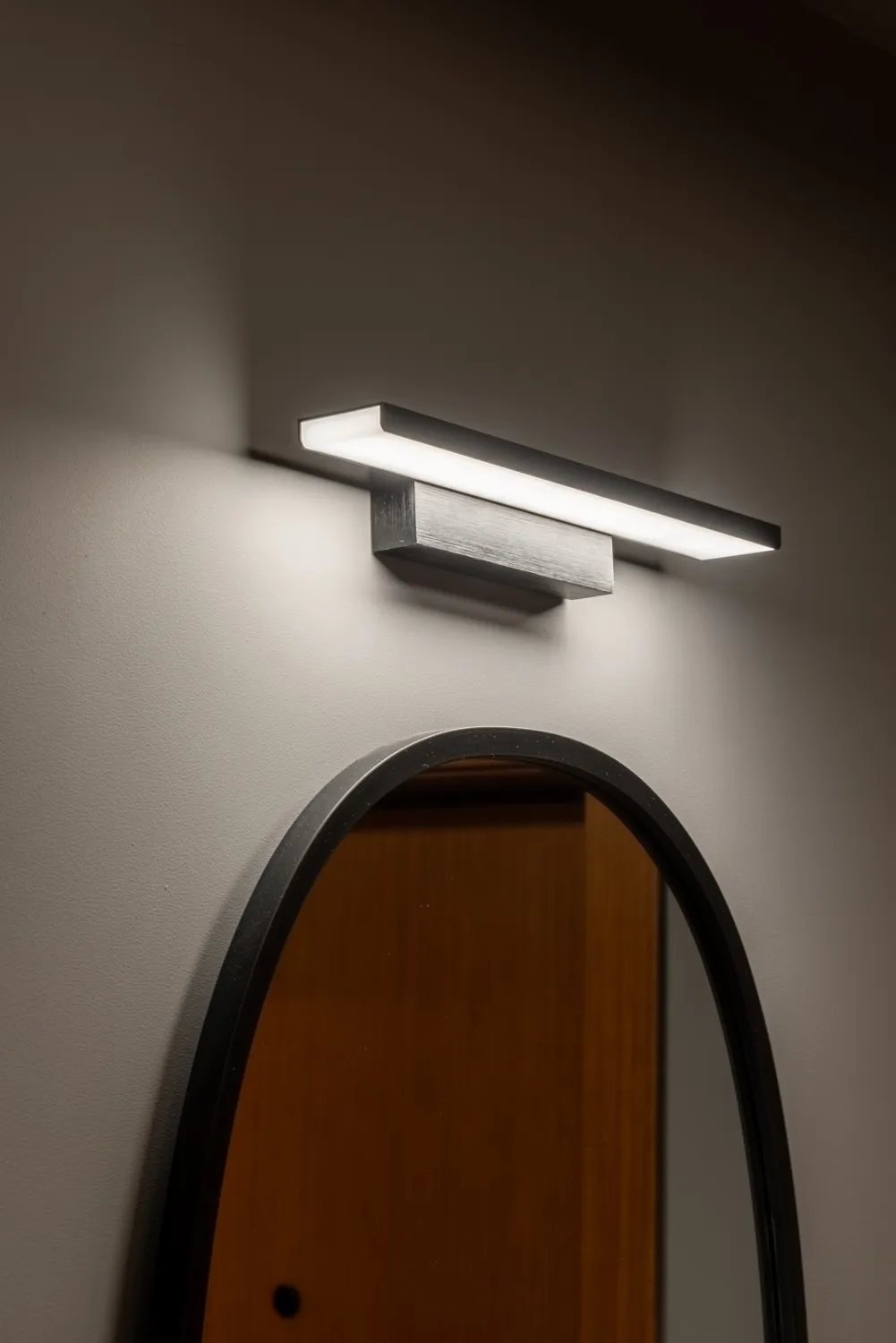 Одним из ключевых элементов интерьера стал настенный светодиодный светильник Sankara LED MRL LED 16W 1009 IP20 черный. Этот светильник стал незаменимым решением для подсветки зеркала в коридоре. Световой поток в 1200 люмен выделяет желаемые элементы декора и обеспечивает комфортное локальное освещение, чтобы смотреться в зеркало стало приятно .