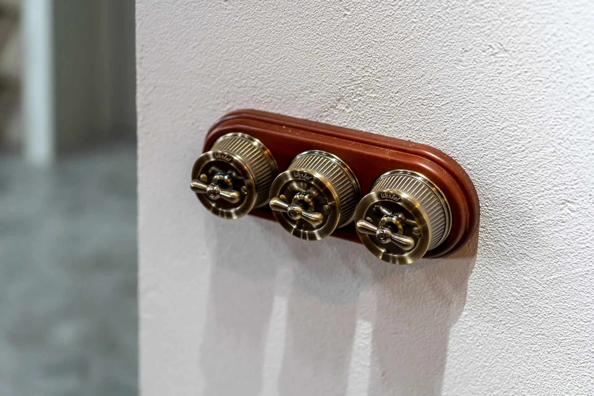 Одним из ключевых элементов интерьера стали электроустановочные изделия Werkel™, выполненные в ретро-стиле. Деревянные рамки плавной формы гармонично дополняют общую концепцию гостиной. Все механизмы имеют прочный керамический корпус, а поворотные выключатели оснащены характерными сменными ручками-барашками. Для разводки использовали ретропровод, закрепленный на стене с помощью керамических изоляторов, что добавило интерьеру аутентичности и шарма.