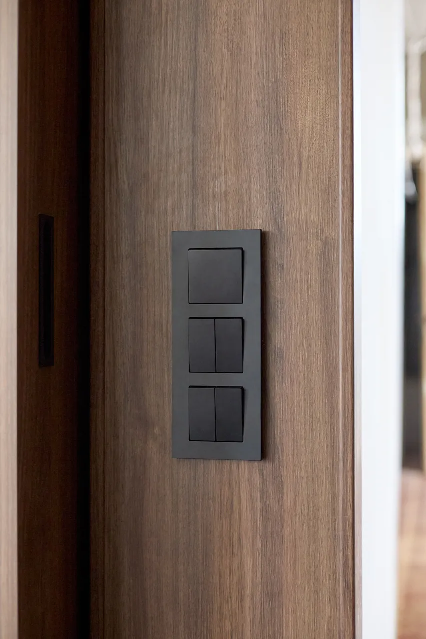 Одним из ключевых элементов интерьера стали электроустановочные изделия Werkel™, выполненные в ретро-стиле. Деревянные рамки плавной формы гармонично дополняют общую концепцию гостиной. Все механизмы имеют прочный керамический корпус, а поворотные выключатели оснащены характерными сменными ручками-барашками. Для разводки использовали ретропровод, закрепленный на стене с помощью керамических изоляторов, что добавило интерьеру аутентичности и шарма.
